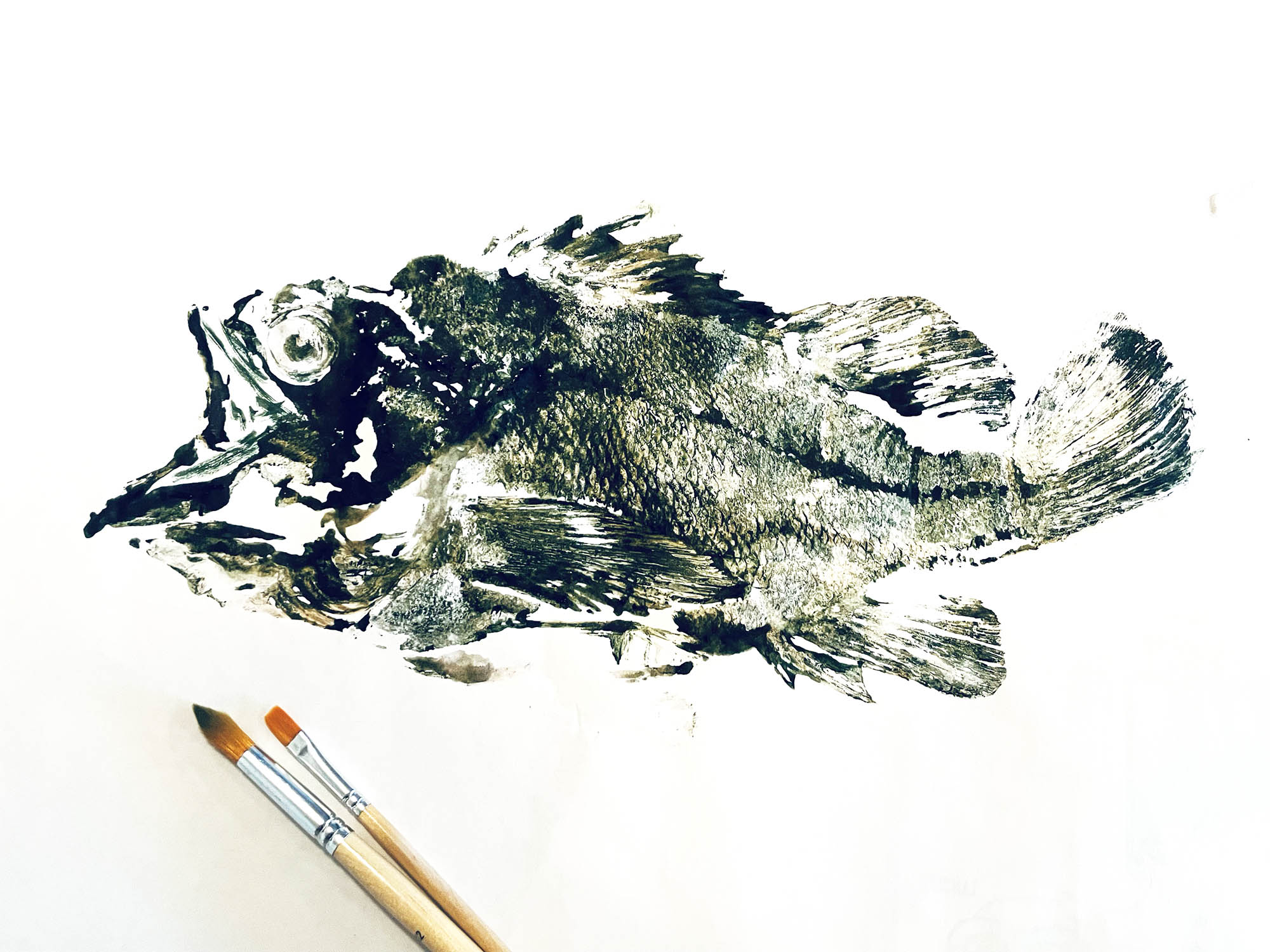 The process itself is relatively straightforward: brush ink over one side of the fish, and press a sheet of paper into it to make the print. Because the eye won’t print, and some areas don’t fully render, I fill in some of the details with a brush and the same ink.